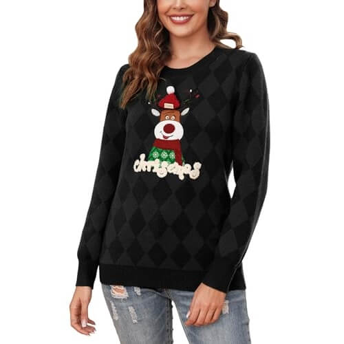 Esprit de Rodolphe – Pull Noir Imprimé Renne et Flocons – Pull de Noël Femme