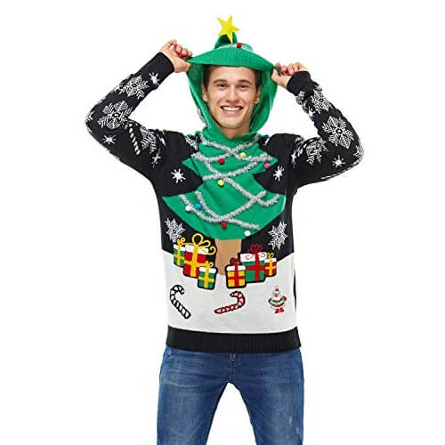 Un pull écologique que tu peux utiliser pour halloween, car tu seras déguisé en sapin, à noël aussi, comme ça t’auras pas besoin de sapin… et ceci tous les ans ! Tu pourras le personnaliser avec de nouvelles boules, guirlandes ou clochettes à ta guise !