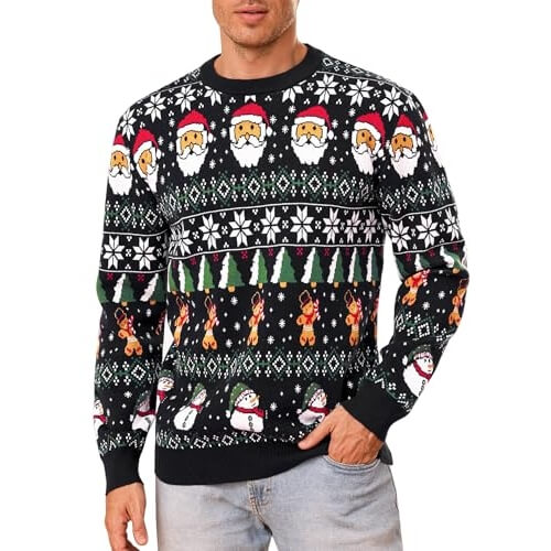 Ce pull de Noël pour homme déborde de motifs « festifs ». On dirait qu’un elfe épileptique a eu accès à une machine à tricoter. Des rennes claustrophobiques s’y côtoient. Les arbres de Noël ressemblent plus à des cactus. Ce chef-d’œuvre est à la mode de Noël ce que le charbon est au cadeau surprise. La magie de Noël n’est pas morte. Vous pouvez porter ce désastre en public.