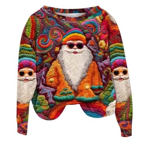 Il est imprégné de graphismes en 3D si réalistes que vous vous attendriez à voir le père Noël bondir de votre torse. Les manches longues enveloppent vos bras d’une étreinte ferme mais faussement tendre.