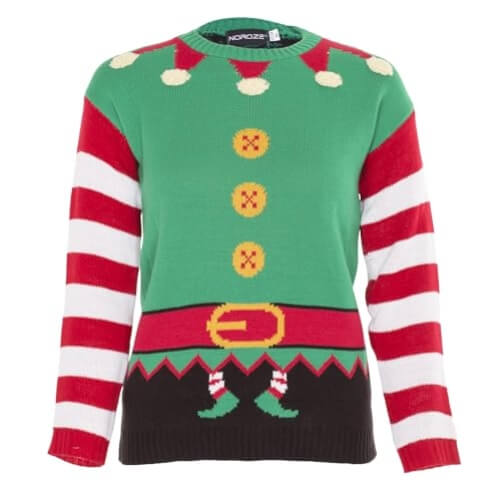 • Manches rayées rouges et blanches, ceinturon rouge avec boucle or et petits chaussons pointus qui dépassent sur le bas du pull noir