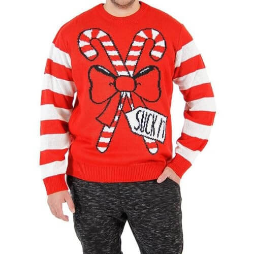 Ah, Noël, cette période où tout le monde se réunit pour célébrer l’amour, la famille et… l’humour salace ? Oui, vous avez bien lu. Ce pull n’est pas pour les âmes sensibles. Avec deux sucres d’orge suggestifs et le message ‘Suck it’ écrit en lettres capitales, ce pull est le summum de la vulgarité festive.
