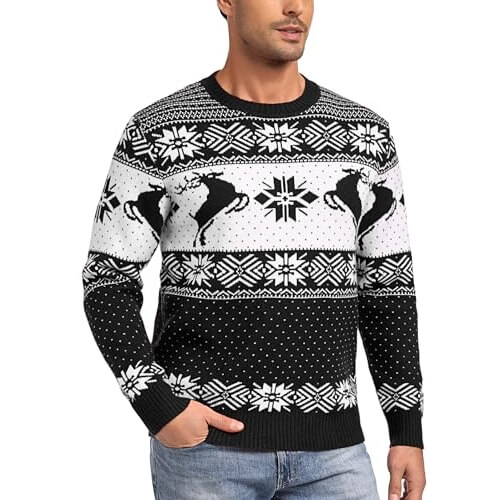 Renne Lumineux – Pull de Noël Noir à Motif de Flocons – Pull de Noël pour Hommes