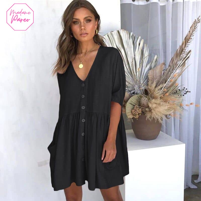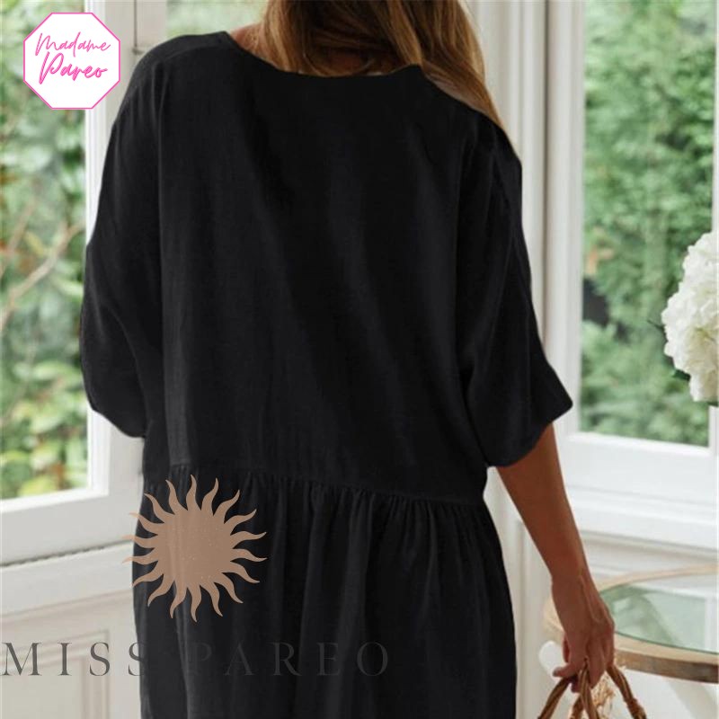 Cette robe ample est faite d’un tissu léger et aéré, parfait pour les jours de chaleur. Sa conception soignée est accentuée par le col en V et la fente à la base, ajoutant un brin de sophistication à votre tenue quotidienne. Découvrez cette pièce incontournable, alliant aisance et élégance sur notre collection de robes pour femme.