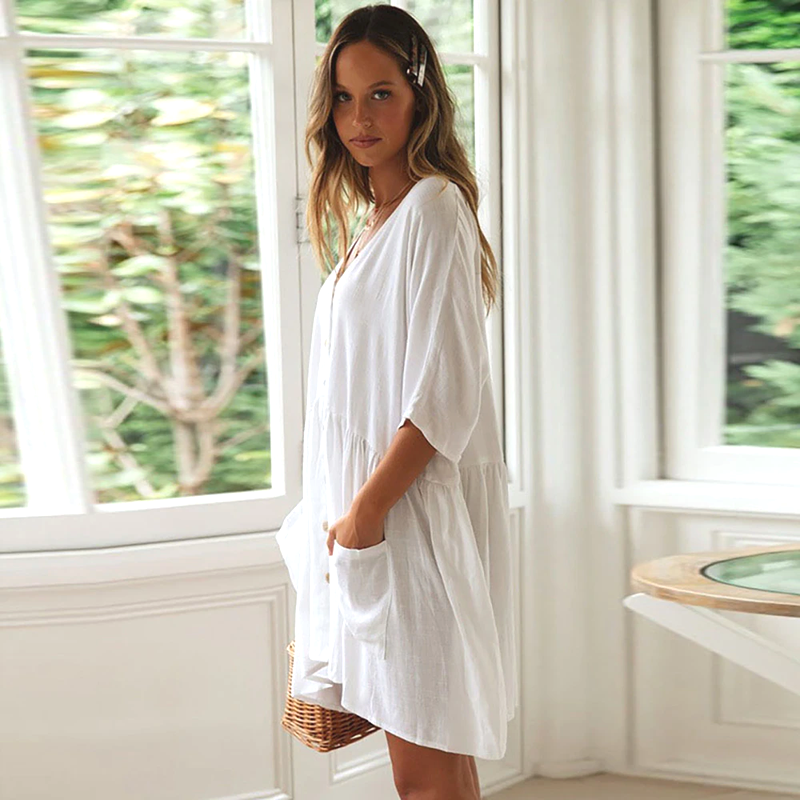 Sa simplicité raffinée rend la Robe Chemise Décontractée Couleur Unie idéale pour toutes occasions, en journée ou en soirée. Accordez-la avec des sandales plates pour flâner en ville ou optez pour des chaussures à talons pour rehausser votre style lors des soirées estivales.