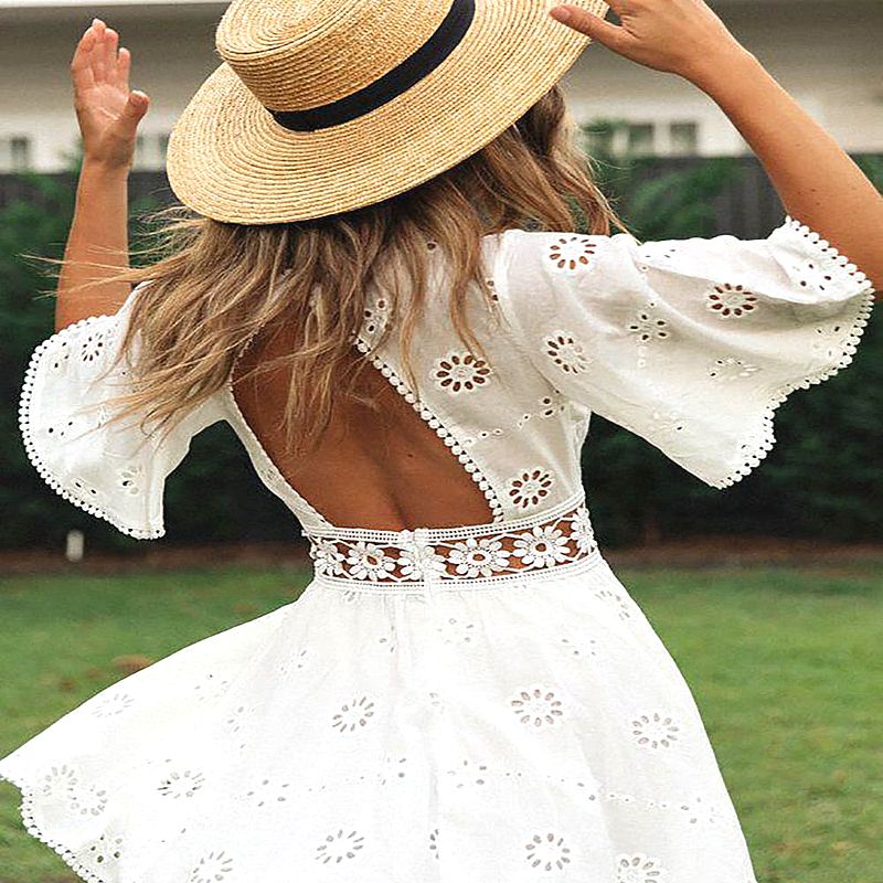 Baignée dans une douce ambiance bohème, cette Robe Dos Nu Courte Transparente à Dentelles Brodées captive avec ses détails en dentelle exquis. La transparence délicate du tissu confère une élégance aérienne, idéale pour se promener avec grâce par un bel après-midi ensoleillé.