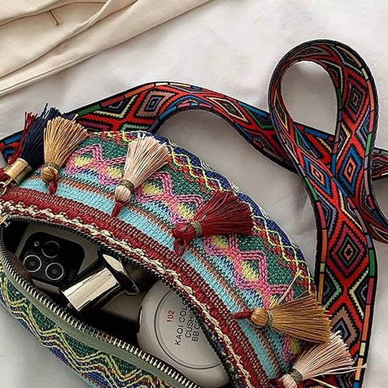 Que ce soit pour une promenade citadine à la ceinture ou un look de festival en bandoulière, ce sac ethnique est un caméléon de la mode qui se plie à toutes vos envies avec grâce.