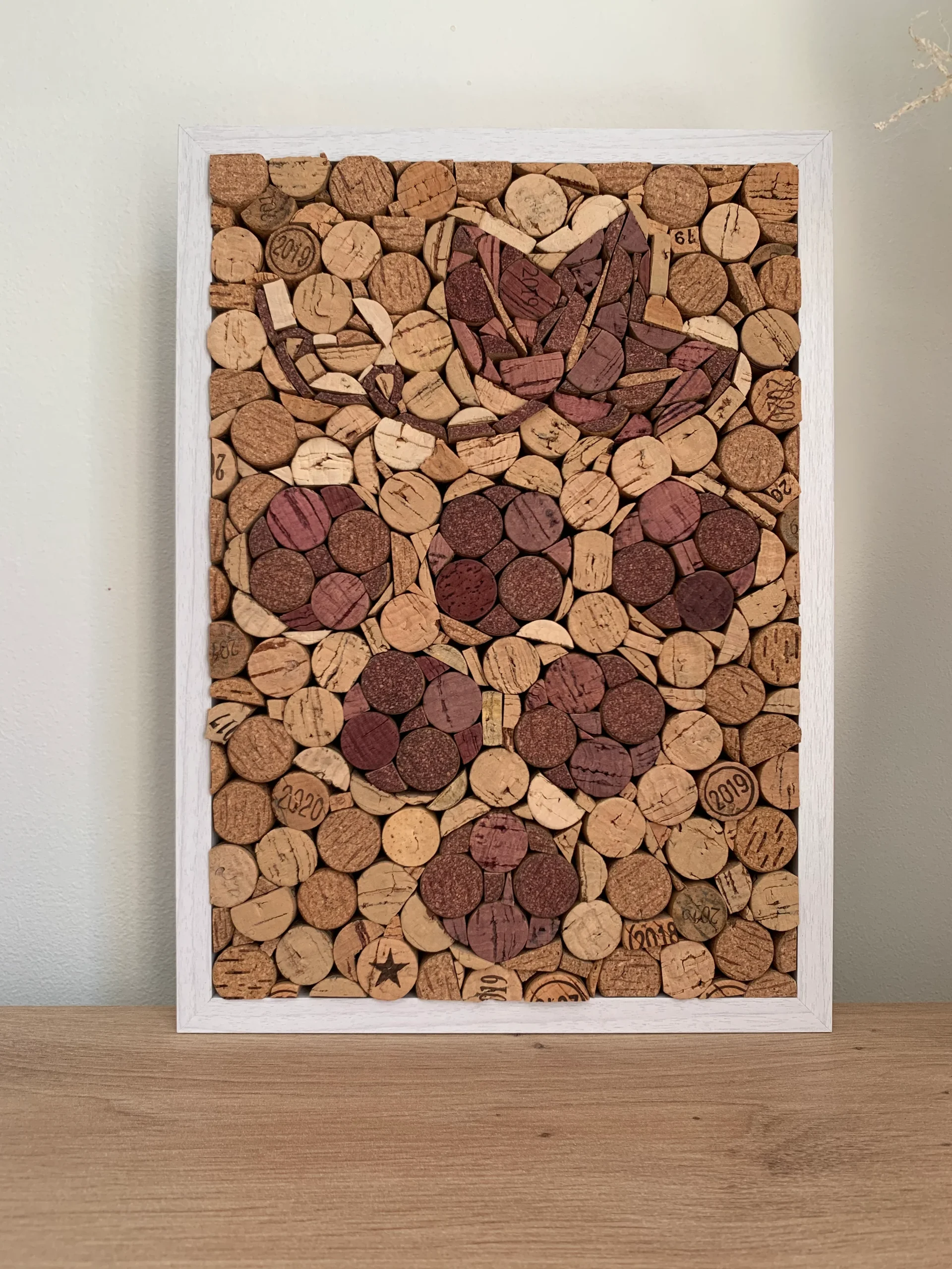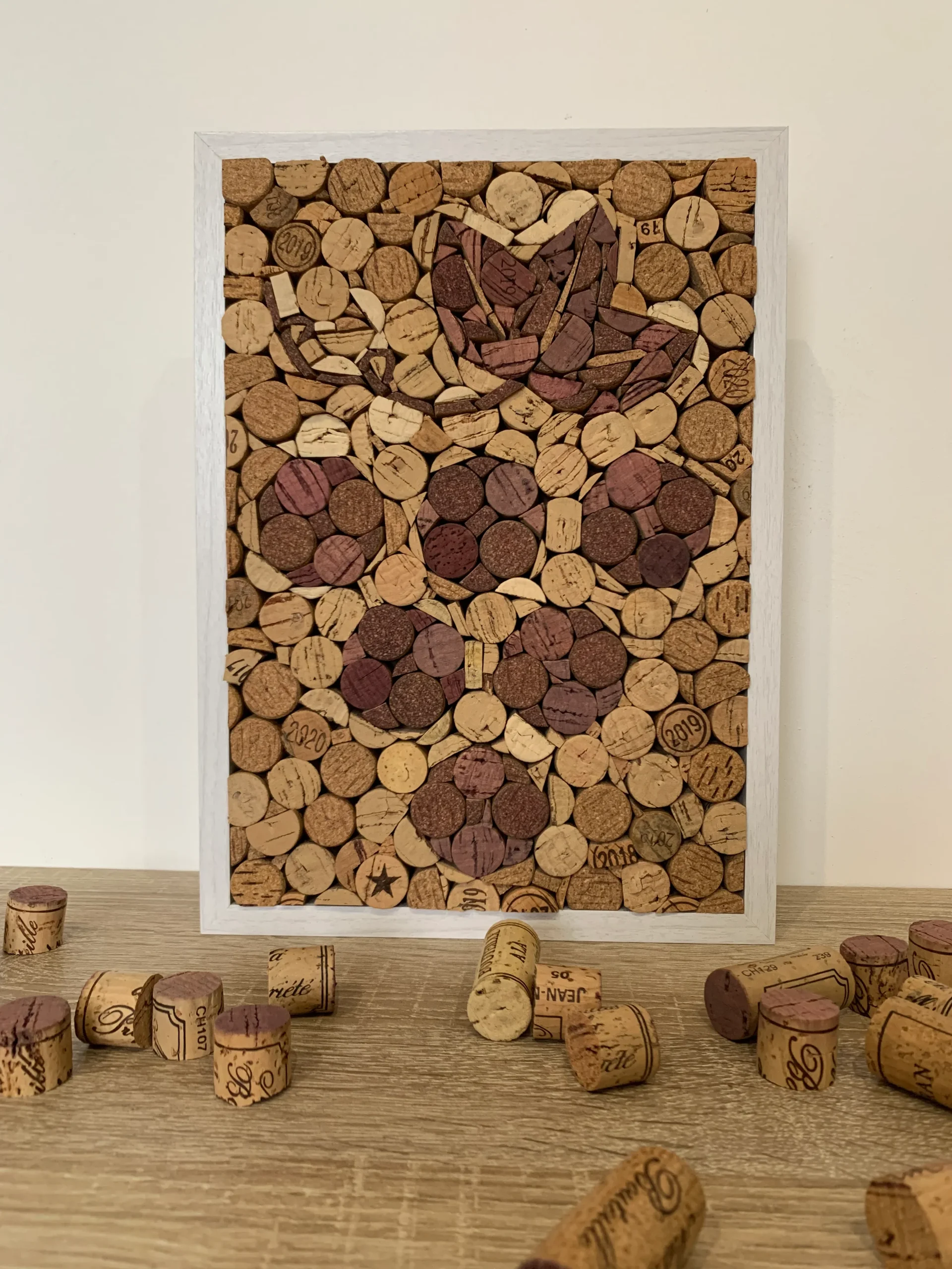 Cadre décoratif fait main, réalisé avec des bouchons de liège, à accrocher au mur ou à poser sur un meuble.