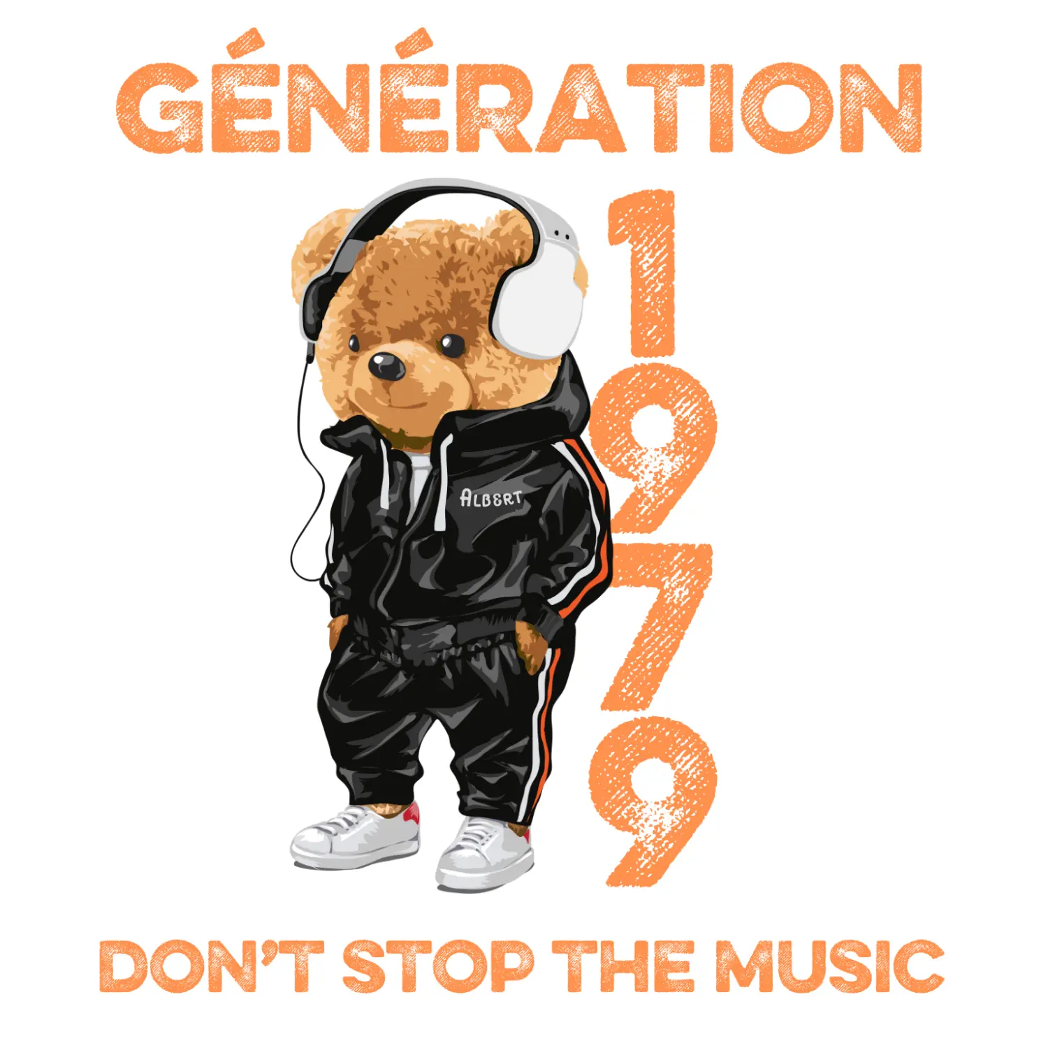 Célébrez votre génération avec un design unique et décontracté. Notre Ourson  habillé en jogging tendance et casque audio sur les oreilles, est prêt à enflammer la piste ! Ce motif stylé inclut :